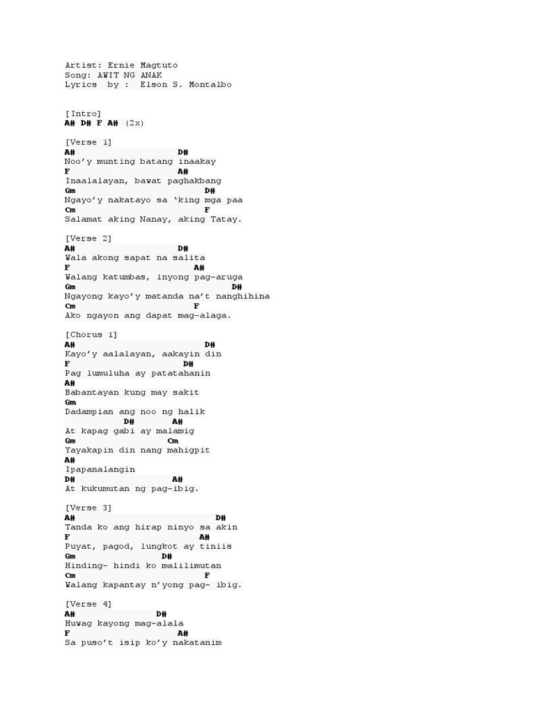 Create and get 5 IQ. Ang awit ng anak sa magulang ay nagbibigay ng mensahe ng pasasalamat ng isang anak sa kanyang magulang. Verse 2 C F Wala akong sapat na salita G C Walang katumbas inyong pag-aruga Am F Ngayong.